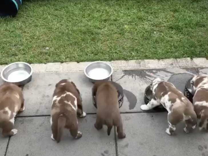 Cette portée de jeunes Aussiedors s'amuse dans le jardin avant d'aller prendre leur petit-déjeuner. Ensuite, ils continuent de jouer avec leur maman et font leurs dents en mordillant un Kong. Pour bien conclure la journée, ces chiots décident de boire le lait de leur maman. Résultat du croisement entre le Labrador Retriever et le Berger Australien, l'Aussiedor est connu pour sa douceur et sa loyauté.