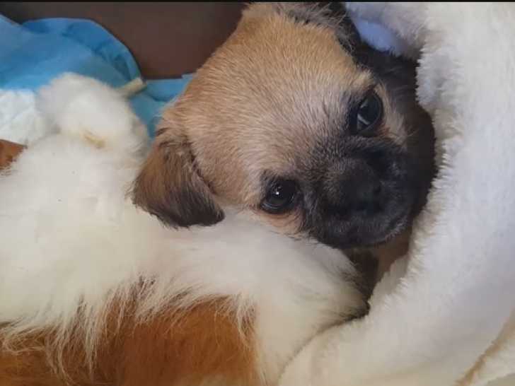 Cette jeune Pugapoo, résultat d'un croisement entre un Carlin et un Caniche, vient de se réveiller. Installée confortablement au chaud sous sa couette, son regard encore fatigué témoigne d'une affection envers son maître. Cette scène reflète la douceur de ce matin partagé entre ce chien et son maître.
