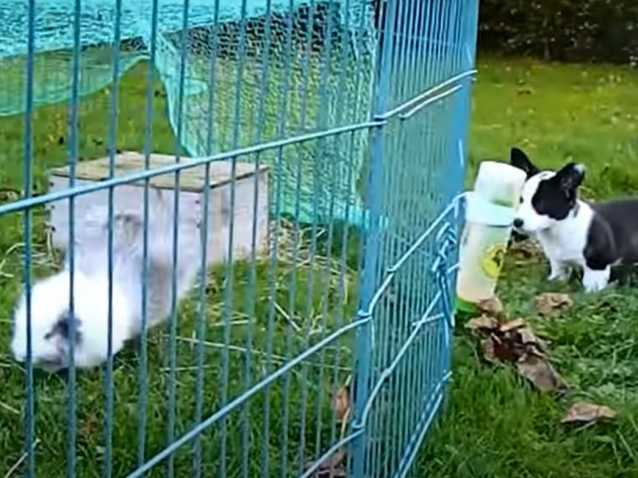 Un jeune Welsh Corgi Cardigan vient rendre une petite visite amicale à un cochon d'Inde qui vit confortablement installé au sein d'un enclos où il ne manque vraiment de rien.