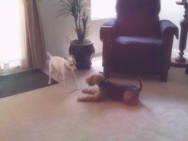Voici une vidéo qui montre Buckley, un Terrier Gallois âgé de 1 an, qui souhaite s'amuser avec Misty, un Jack Russel de 13 ans et demi. Bien entendu, le Jack est plus calme en raison de son âge, mais la partie de jeu se déroule sans agressivité entre les deux chiens.